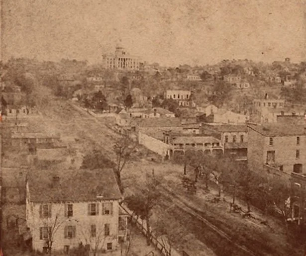 Looking east down Monroe Avenue towards the State capitol, Montgomery, Alabama. (Alabama Department of Archives & History.) Passing through the city in April 1863, Missourian Henry Cheavans found Montgomery “a beautiful place…Green trees shading the streets in pleasant contrast to the white houses of the citizens…Our boys bought quite a number of cedar canteens at 75 cents.” The Journal of Henry Martin Cheavans (United States: Literary Licensing, LLC, 2011), p. 35. Montgomery Arsenal was located approximately half a mile due north of this image. In January 1865 the Arsenal’s commander estimated a production capacity of 8,000 cedar canteens per month.