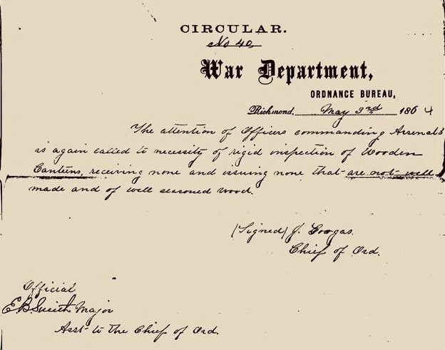 Corroborating evidence indicates that Wagner’s summer 1862 “canteen department” was intended for the manufacture of cedar canteens. Other installations such as Atlanta, Richmond, and Charleston set up tin shops where quantities of tin canteens were intermittently made, and Montgomery is known to have issued tin canteens.(70) Having said that, Ordnance Bureau tin shops never focused exclusively on canteens. No other arsenal or depot (save Selma) is known to have established a permanent “canteen department.” Further, “3,000 to 5,000 per week” would have required an enormous and readily available supply of raw material. No ordnance installation ever systematically fabricated tin canteens in numbers even faintly approaching 1,000 per week, much less a projected 3,000-5,000.(71) Sheet tin was available, but not, upon information and belief, in such relatively massive quantities. Conversely, cedar timber was abundant and accessible. As will be discussed, when Richmond Arsenal subsequently requested the assistance of Selma and Montgomery in filling a massive requisition for the Army of Northern Virginia, wooden, not tin, canteens were specifically sought.