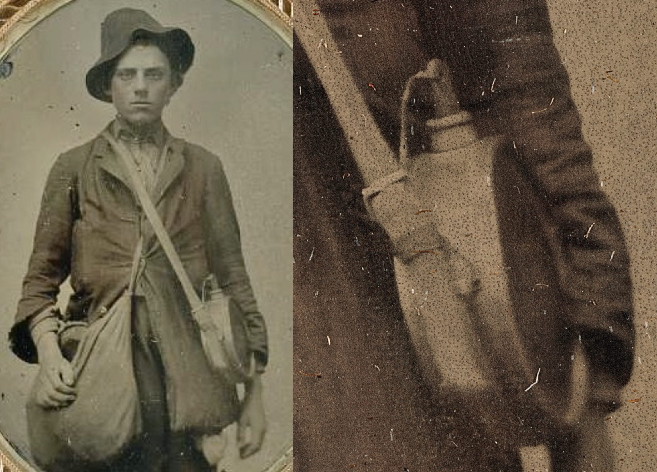 Liljenquist Family Collection of Civil War Photographs (Library of Congress.) Image depicts Pvt. Edward G. Savage of the 100th Illinois Infantry. Captured just north of Nashville on November 10, 1862, Savage was paroled three days later – but not before being compelled to exchange his uniform and accoutrements for a seedy civilian coat, a shapeless hat, an oversized Rebel haversack, and a Rebel wood canteen. Savage had his image taken shortly afterwards. (See https://dan-masters-civil-war.blogspot.com). A product of the first documented year of production (12/61 to 12/62), the observable characteristics of Savage’s canteen are noteworthy. The spout on the canteen is factory-made. The strap appears to be cloth, secured with a roller buckle. The sling bracket is hidden beneath the tongue of the strap. The stopper with tapered pull is most probably field-made; if they were issued with the canteens, the fact has not been recorded. The only known instance of stoppers being supplied is an 1863 Atlanta Arsenal contract for 1,000 maple wood canteens; each was to be delivered with a “good cork.”