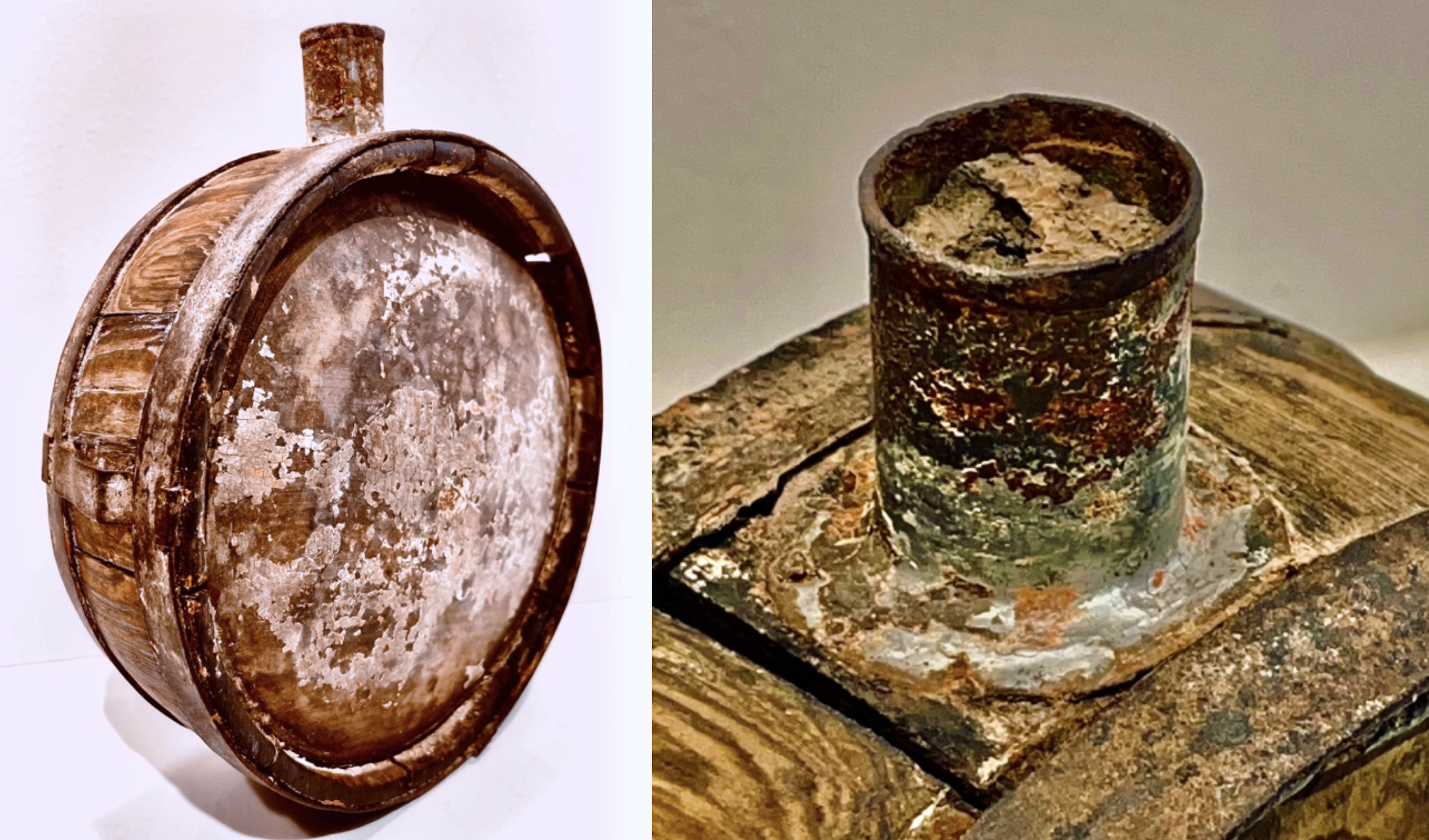 Anonymous survivor: battered cedar canteen with hand-carved spout. Private collection.