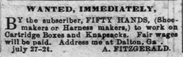 Southern Confederacy (Atlanta, GA), July 28, 1861. In addition to promoting his wood canteen pattern, Fitzgerald was kept busy with his “large contract for the Government.” Between 31 August and 18 November 1861, Fitzgerald’s Dalton shops manufactured and shipped at least 10,277 sets of infantry accoutrements, 7,049 knapsacks, and 4,500 tin canteens.