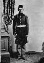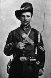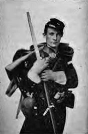 Above is Sgt. Alfred Ream of Co. I as he was ready to start to war. In addition to his regulation outfit he was presented by the boys and girls, with revolvers, bowie knife, blacking brushes, needle box, writing paper, pens, pencils, pipe and tobacco, a bible, deck of cards, hose, shirts, handkerchiefs, etc. In the picture he looks like a walking arsenal, but in six months he got rid of most of them. Revolvers, bowie knives, etc., were the most useless things a soldier could carry when he had a musket. I do not remember how it was with Comrade Ream, but I remember one comrade of Co. C that started with as much in his knapsack as Comrade Ream, but as it was rather shrunken one day on a march, I asked him what he had in it, and he responded: "A navy plug and history of the four kings." A great many soldiers on a march threw their knapsacks in a wagon and made a roll of their blankets and tied them so as to make a collar over one shoulder and under the arm on the other side.